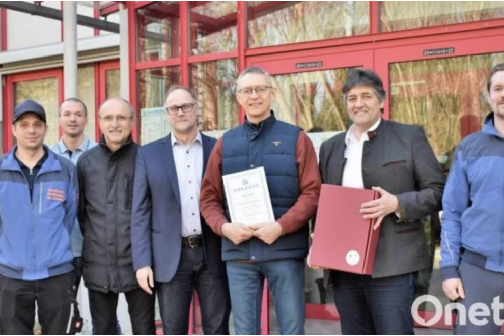 Bürgermeister Edgar Knobloch (rechts) und technischer Leiter der Stadtwerke Gerhard Maier (links) gratulierten Abwassermeister Johannes Zinnbauer (Zweiter von links) und…